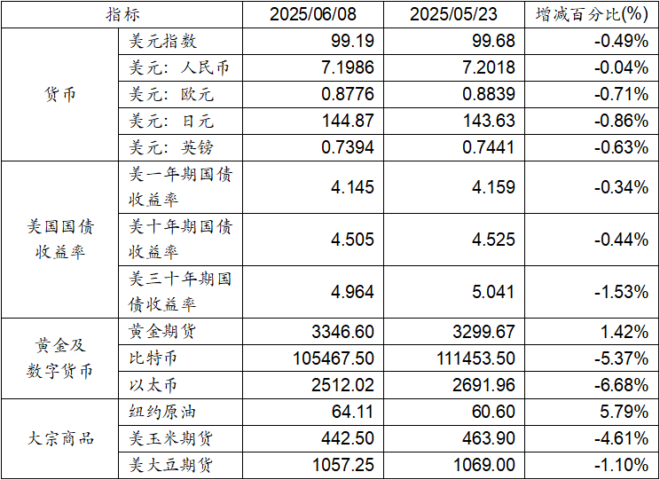 5月23日至6月8日,美元指數(shù)下降0.48%,美元兌人民幣匯率下跌0.04。美國一年期十年期及三十年期國債收益率均呈現(xiàn)下跌態(tài)勢。黃金期貨價格上漲1.42%。比特幣下跌5.37%。以太幣下跌6.68%。大宗商品中紐約原油價格上漲,而玉米期貨及大豆期貨價格則呈現(xiàn)上漲態(tài)勢。