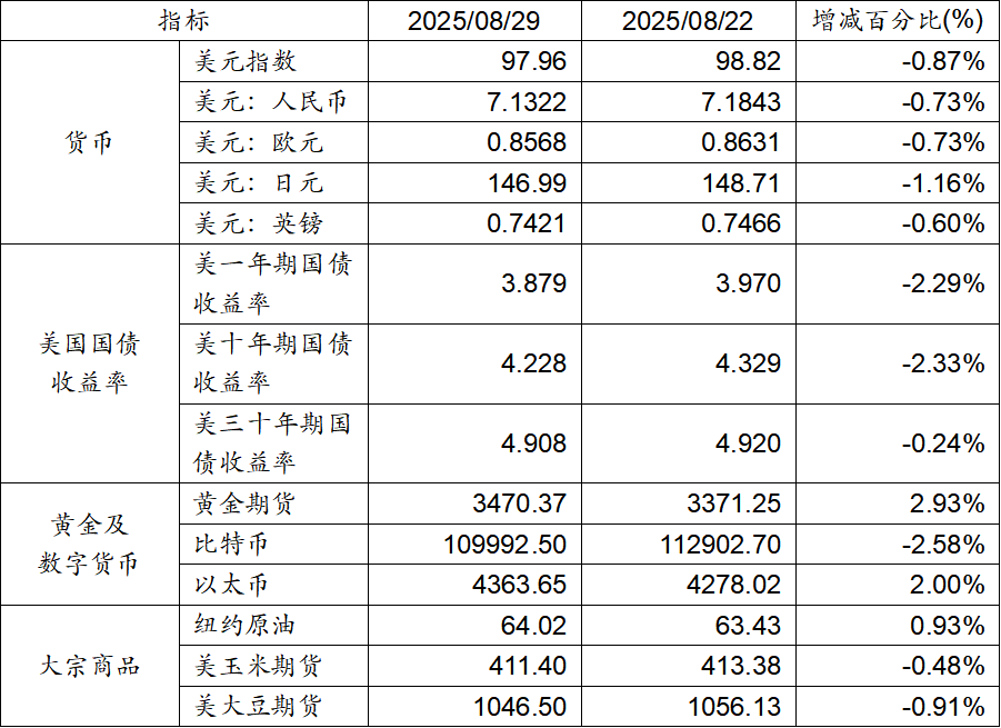 8月22日至8月29日,美元指數(shù)下跌0.87%,美元兌人民幣匯率下跌0.73%。美國一年期、十年期及三十年期國債收益率均呈現(xiàn)下降態(tài)勢。黃金期貨價格上漲2.93%。比特幣下跌2.58%。以太幣上漲2.00%。大宗商品紐約原油價格上漲,而玉米期貨及大豆期貨價格則呈現(xiàn)下跌態(tài)勢。